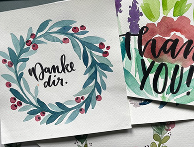 Inspiriert von der Natur im Frühling kreieren wir mit Aquarellfarben und -stiften Blüten, Blätter und vieles mehr und kombinieren unsere farbenfrohen Kunstwerke mit individuellen Letterings.